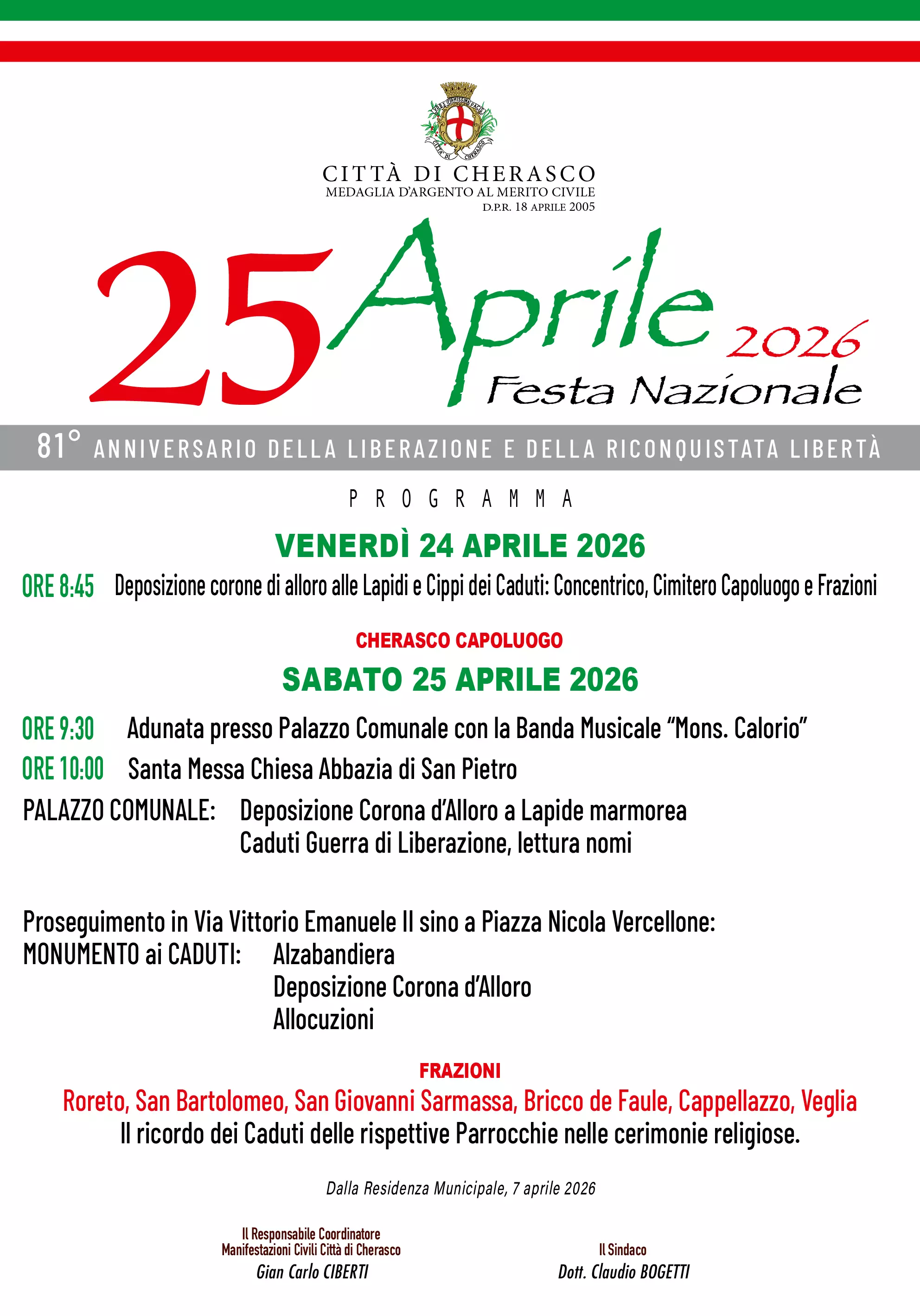 «Il 25 aprile rappresenta una data fondamentale per il nostro Paese. – dice il sindaco Claudio Bogetti - A Cherasco rinnoviamo con convinzione il nostro impegno a custodire la memoria della Liberazione, rendendo omaggio a chi ha sacrificato la propria vita per la libertà. Oggi, in un momento segnato da conflitti e tensioni internazionali, è ancora più importante fare memoria e riaffermare con forza i valori di democrazia, pace e responsabilità civile. È nostro dovere trasmetterli alle nuove generazioni, affinché non vengano mai dimenticati».