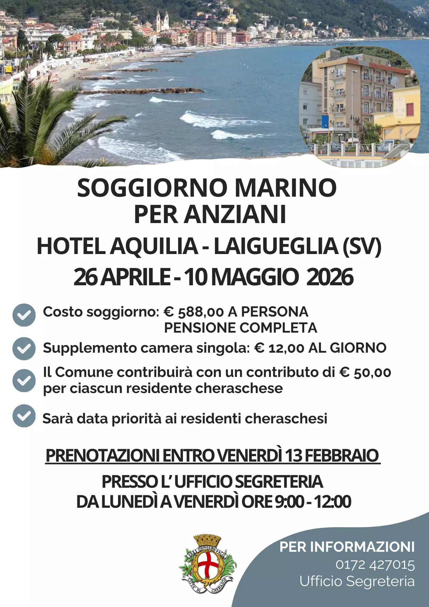 Da diversi anni l’Amministrazione Comunale promuove il soggiorno marino dedicato agli anziani, residenti e non, con l’obiettivo di favorire la socializzazione e offrire momenti di svago e attività ricreative. Anche per il 2026 l’iniziativa viene riproposta e la destinazione scelta è Laigueglia, in provincia di Savona.